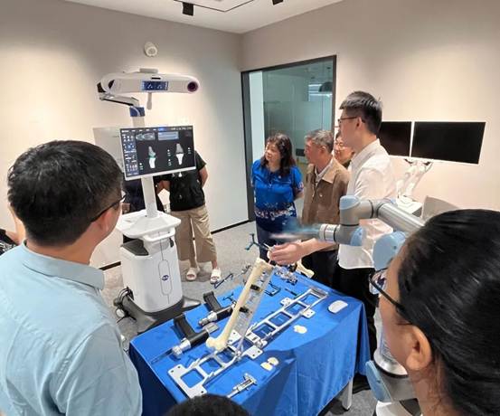在广东艾目易科技公司,学会一行了解了公司的发展历程和核心技术布局及公司在手术机器人定位导航技术、智能医疗装备等领域的创新成果。高端智能医疗器械科技服务团专家顾汉卿教授对艾目易自主研发的高精度光学定位系统、智能手术导航规划系统与研发人员进行了深入交流。在联学共建期间,医工结合不是简单叠加,而是需要深度碰撞和持续互动。